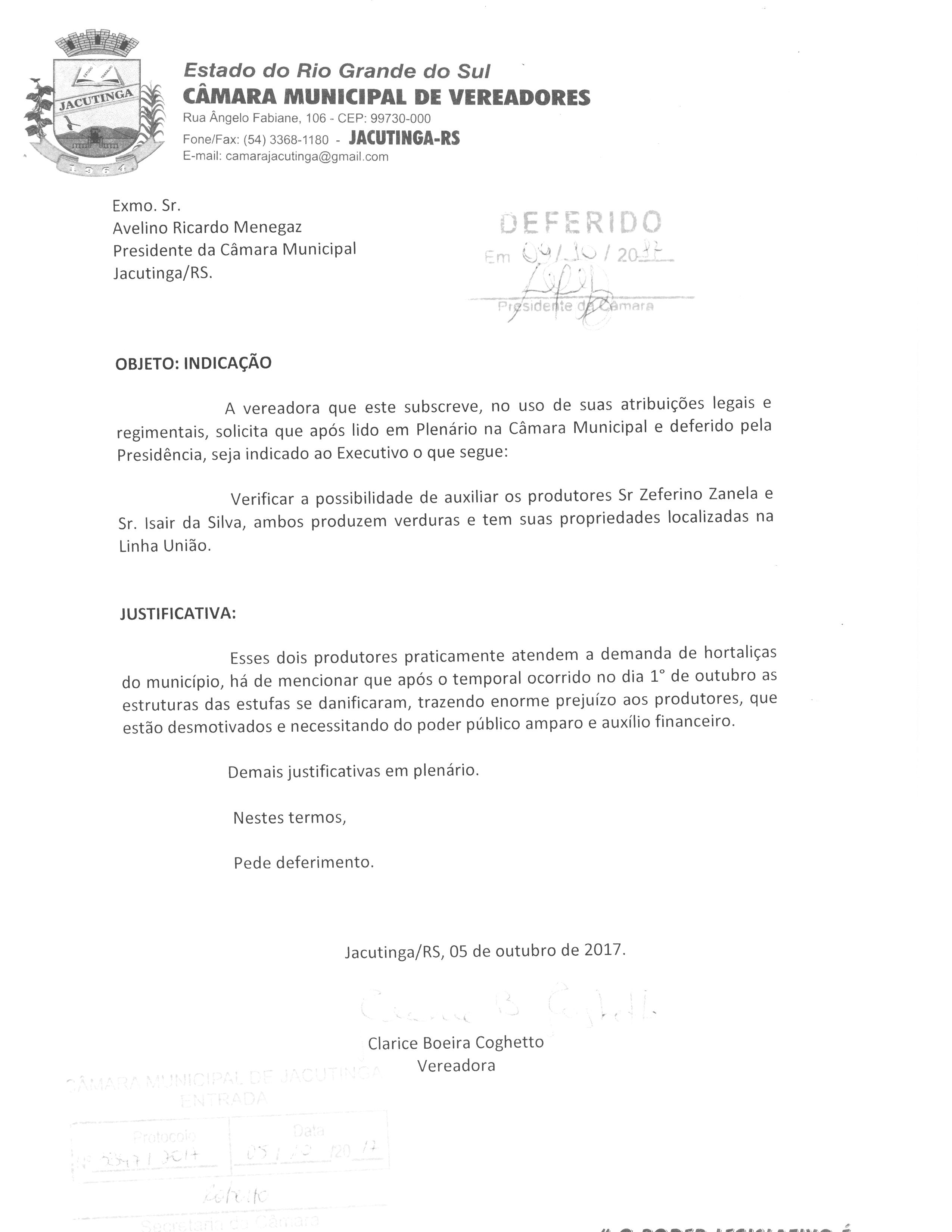 Sugere o auxiliar financeiramente os produtores Sr, Zeferino Zanela e Sr. Isair da Silva, produtores de verduras