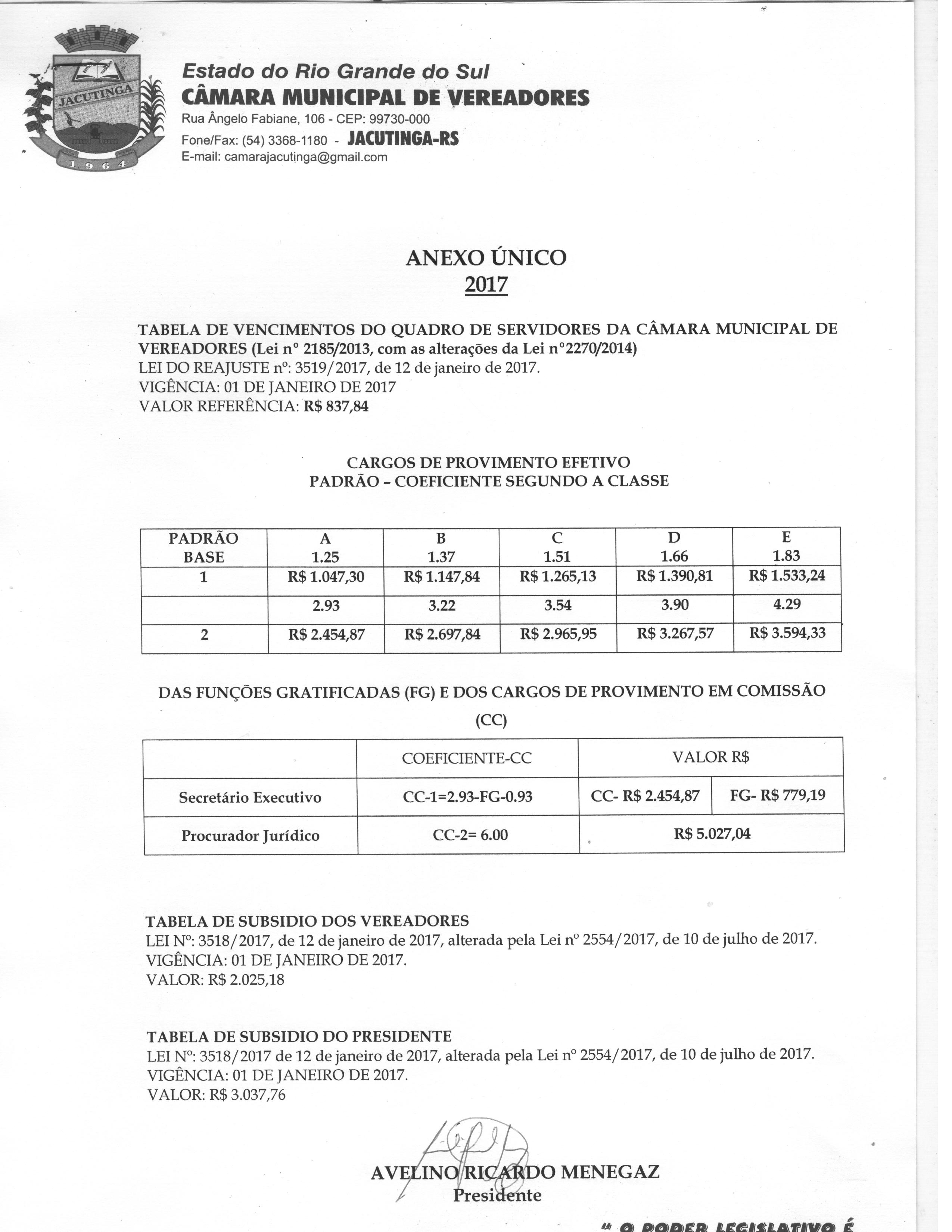 TABELA DE VENCIMENTOS DO QUADRO DE SERVIDORES DA CÂMARA MUNICIPAL DE JACUTINGA - 2017